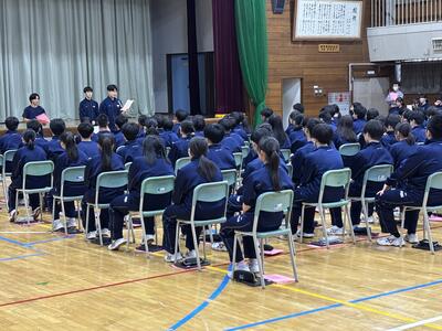 一覧へ 5.16(金)3年生修学旅行前日集会 投稿日時: 05/16 編集長 5月19日(月)からの修学旅行に向けて、3年生は前日集会を行いました。実行委員長からは、修学旅行のテーマ「集学良高」についての意味を再確認し、関わってくれた方々への感謝、最高の思い出となるように、礼儀やマナーを守り、青葉中3年生として良い修学旅行にしようという強い決意を話していました。仲間を大切にして、思いやりあふれる旅行、3年生の仲がより深まる3日間にしてほしいと心から願っています。