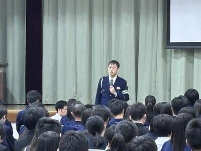 北海道札幌方面千歳警察署交通第一課長が来校され、交通安全教室を行いました。自転車の安全運転、ヘルメットの重要性についてなどの話がありました。また、公園や施設など、地域の方々から中学生は見られているので、ルール、マナーを守り生活しましょうとの注意も受けました。ヘルメット着用の努力義務ですが、命を守るために着用することが大切であると力強く話していました。