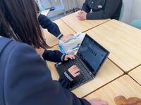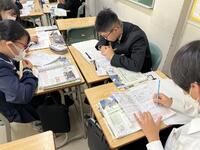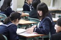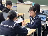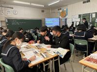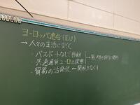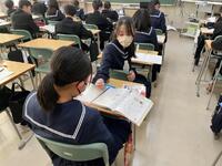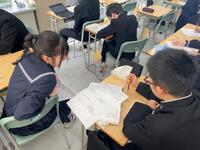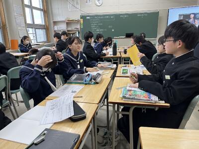 1年生社会科では、ヨーロッパ連合(EU)が、なぜ統合に向かったか・・・様々な資料や統計グラフ等(資料活用)をもとに、グループで考えを出し合い、対話の中から深め合っていました。「1ユーロって何円ぐらいだったっけ?150円くらいじゃない・・、1ドルと1ユーロを円に換算すると同じくらいかな・・、この収入のグラフは円に換算すると・・。」そんな会話がとびかいます。資料活用の力とともに、様々な資料をもとに、地理・歴史・公民的な視点で、「なぜこうした動きになったのか」社会を読む、自ら考える力がついてくるなあと感じる授業でした。