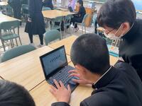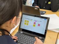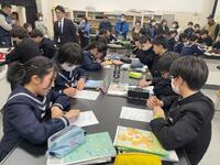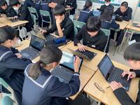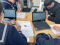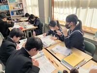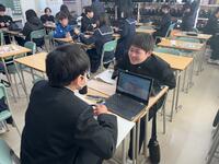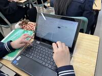 フォームを利用して、教科書の記述に、戸部君の心の言葉を加えた文章は、クラスの人数通りの解釈が・・。班の仲間との対話から、ヒントをもらったり、他者の考えも取捨選択しながら、自分なりの「戸部君視点の物語」にねばり強く取組んでいました。登場人物の行動、情景描写から登場人物の心情とその変化を読み取り、それを根拠にして作品を深く「読み解く」・・。「読み解いて、ひたすら自分なりに書いてみる・・」結構な文字数で、ねばり強く書き表し、生き生きとした表情で、意見交換する生徒達が印象的です。