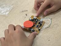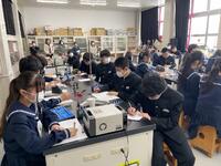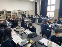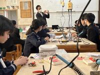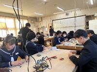 技術科では、ラジオを作成していました。LEDライトつきなので、LEDライトの特性や使われている用途等についても説明され、基盤のはんだごての手順や注意事項等について、熱心に学んでいました。「ものづくり」の分野では、周囲の人と協力したり、できばえを比べ合ったり、近くの人とポイントを確認し合ったり・・そこで生まれる対話も学びを深める協働です。