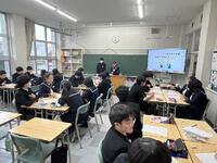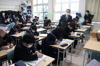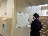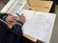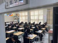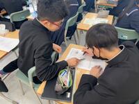 3年生の廊下には、「落語」の芸術鑑賞教室の時、寄席文字で色紙をお願いした「合格祈願」の文字。また、修学旅行で、訪れた学問の神様「菅原道真公」を祀る、全国天満宮の総本社である北野天満宮の学業成就の御守りが飾られています。3年生数学の「理解できていない問題の再チャレンジ」の場面では、わかっている人にレクチャーを受けながら「自律解決」を図る姿に、受験生として学びに対して、いいチャレンジ、いい協力ができていることに感心させられます。「わかっている段階から、自分でできる段階まで」、ねばり強いチャレンジに期待します。