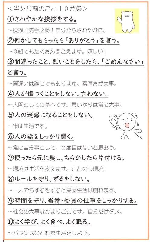 3年生の通信に掲載された、『あたり前のこと10カ条』は、すべての小中学生に身につけてほしい力であり、「社会に出て、最も必要となる基本的な能力」だと感じます。ぜひ、1,2年生も参考にしてみてください。
