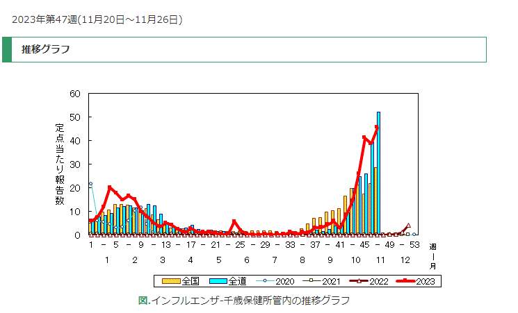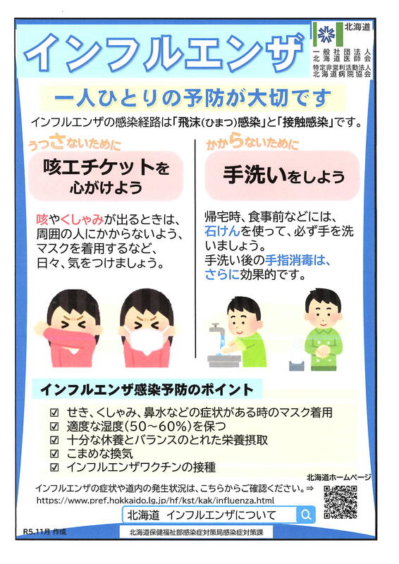 2023年第43週(10月23日~10月29日)までのやや古いデータですが、札幌圏、千歳保健所管内のインフルエンザの報告数が急増しています。石狩管内においても、主に小学校で、学級閉鎖、あるいは学年閉鎖等の報告や児童生徒・教職員の感染が11月の連休明けに急増。十分な警戒といつも以上の予防の対応が必要です。千歳中学校区の小学校にも、学級閉鎖が出ていますので、各ご家庭でもご留意ください。新型コロナ感染も一定数の報告があり、予防措置としては大きな違いがないので、乾燥する季節、季節の変わり目、特に注意が必要です。北海道の注意喚起のリーフを掲載します。