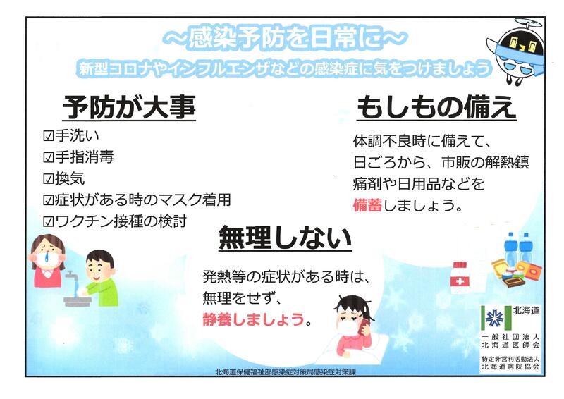 朝夕はめっきり気温も低くなり、1日の寒暖差も大きくなっています。雪虫もちら舞っていますから、初雪も近いのかもしれません。石狩管内各市町村では、インフルエンザや新型コロナウイルス感染症等により、学級閉鎖やかぜ罹患者の増加も見られます。季節の変わり目の温度変化、高温多湿から、乾燥した空気となる季節には、体調管理に十分気をつけなければなりません。