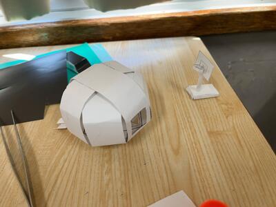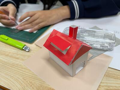 特設の1年生美術では、「クラスみんなで町づくり」に意欲的に取り組んでいました。個として「理想の家づくり」に取り組みながら、住所を割り当てられているので、町内や通り、町が町らしく見えるポイントアイテム等について、対話しながらイメージ化を図っていきます。「素敵な街灯をどの家にもおきたい・・」、「看板や標識・・」、町内や通り、創りたい町の雰囲気をより表現できるような工夫が話し合われます。また、個の「理想の家づくり」の作業の中でも、町全体をイメージを意識しながら制作に集中していました。