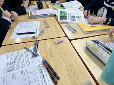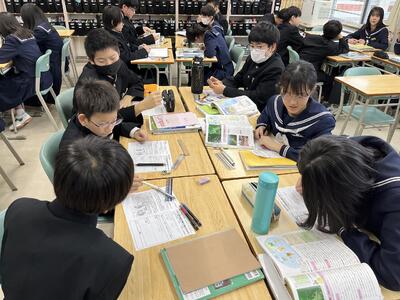 3年生国語では、短歌を分担しながら、表現技法や解釈についてスライドを作成してプレゼンしていました。個々で調べた内容を共有し合い深めます。アウトプットすることで、より確実な定着も・・。