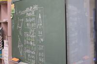 なぜお菓子の袋が膨らんだのか気体の粒子を用いて説明してみよう・・という実験・考察・まとめに取り組んでいました。「目の前で、起きている科学現象を(理科特有の見方・考え方を働かせて考え)理科・科学的なことばを用いて説明できることが大切。「空気を抜くことで、粒子が減り・・」「容器内の気圧が低くなるので・・」「風船内の気圧の方が高くなるので・・」グループごとに、起こっている現象を、図や言葉の表現で、発表していました。主体的に学び合う姿勢が立派です。「起きている現象の説明」には、最適解もあると思うので、「対話的に学び合うことで、みんなが最適解に達して、自分の言葉で表現・説明できるようになってほしいなぁ」と感じる授業でした。