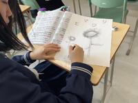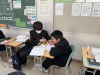 1年生の国語の授業、つながりの中で「星の花が降るころに」では、登場人物の行動や発言から、その心情の変化や心の動きを読み取る授業をしていました。単元の目標である「文章を、場面の展開や登場人物の描写などに着目して読み取る。(文章のつながりを読む)」「登場人物のものの見方や考え方について、自分の考えをもつ。(自分の考えとつなげる)」という目標にあるように、『戸部君の視点で物語を書いてみよう』という課題に、生徒達は、登場人物の描写から、その心の動き、こころの言葉を読み取って、物語に加筆していきます。