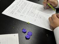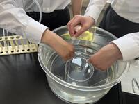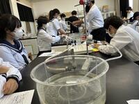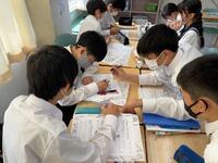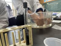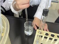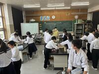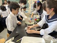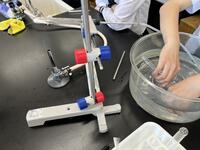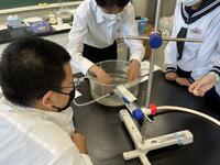 1年生理科 化学反応で、発生する気体を「水上置換」で集めていました。不思議と「科学者っぽく」「中学生らしく」見えてきます。中学校生活約2か月・・中1の頃の成長度合いは大きいですね。