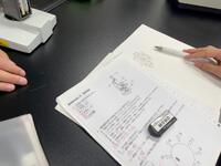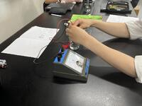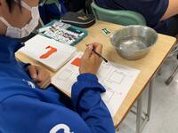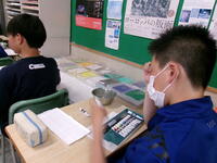 3年生理科 水溶液に入れる金属板を数種類の金属に変えながら、電気が発生するか電圧計で測定。測定結果を金属板ごとにスプレットシートに記入していき、実験結果を他の班と比較・共有しながら「電池のしくみ」を学んでいました。