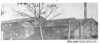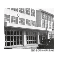 左から、昭和22年仮校舎「青年学校校舎」・昭和26年 現在地に開校「旧海軍兵舎」・昭和62年現校舎・2023年
