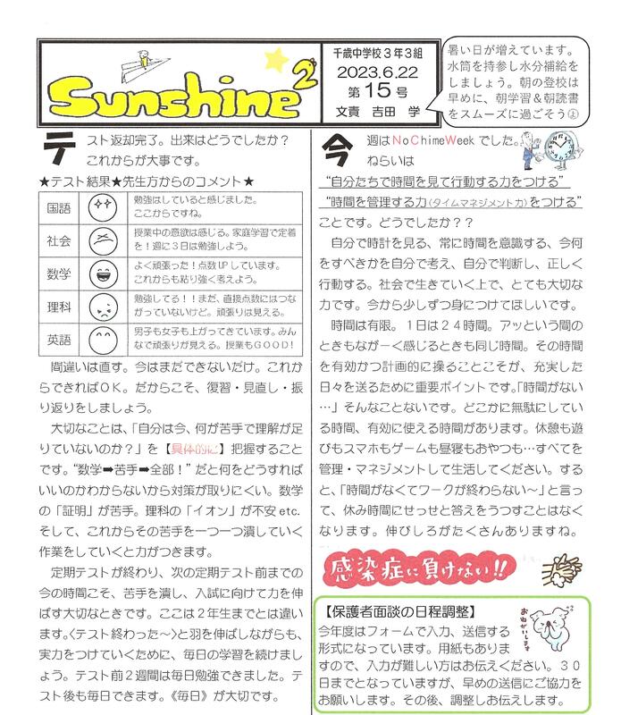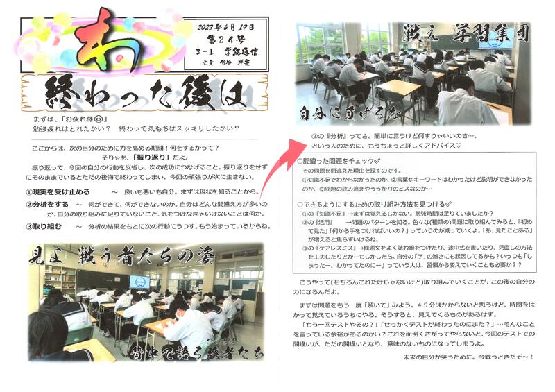 2年生、3年生にとっても学年最初の定期テストです。「強みを伸ばし、弱点を克服する」学習と生活の振り返り・・「できている・できていない」の確認とともに、できていないところを先延ばしにせず、克服の努力と進路を見通した学習計画の見直しを進めていきましょう。