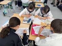 3年生社会では、「マスメディアと政治」の単元でしょうか・・数社の新聞を読み、記事内容の取り上げ方や特徴等について、グループで協力しながら整理していました。対話から「気づき」が生まれ、思考を共有しあうことで、「より深い理解や学び」が生まれます。