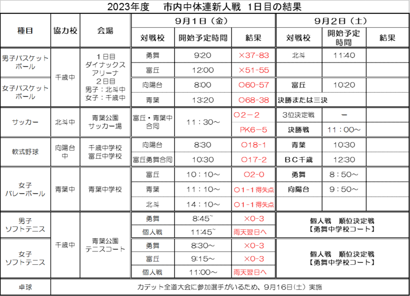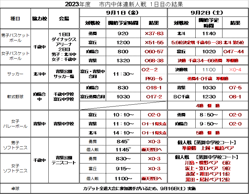 屋外種目も、何とか開催された中体連2日目。女子テニスの個人戦が11日(日)に開催となりましたが、その他種目については市内大会を終えています。団体戦・個人戦のある種目結果については、結果集約後にお知らせいたします。