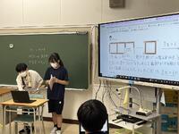 計算の順序が①( )の中 ➁(中学校で出てきた)累乗 ③乗法・除法 ④加法・減法 であることを確認し、各班からA~E問題を担当する人を選出。『各班のA担当者・B担当者・・・がグループをつくって集まり、解答と説明の仕方を練り合い』ます。A~Eの担当者は、各班にもどり、『自分の班にそれぞれの解法の考え方を説明します』。四則計算や累乗等、入り交じった問題を計算の約束や計算順序等、数学的な見方・考え方に着目して、根拠をもとに筋道を立てて考え、豊かに表現するタブレットも上手に活用した授業でした。活発な教え合い、学び合いから、自ら学び取ろうとする姿に1年生の成長を感じます。
