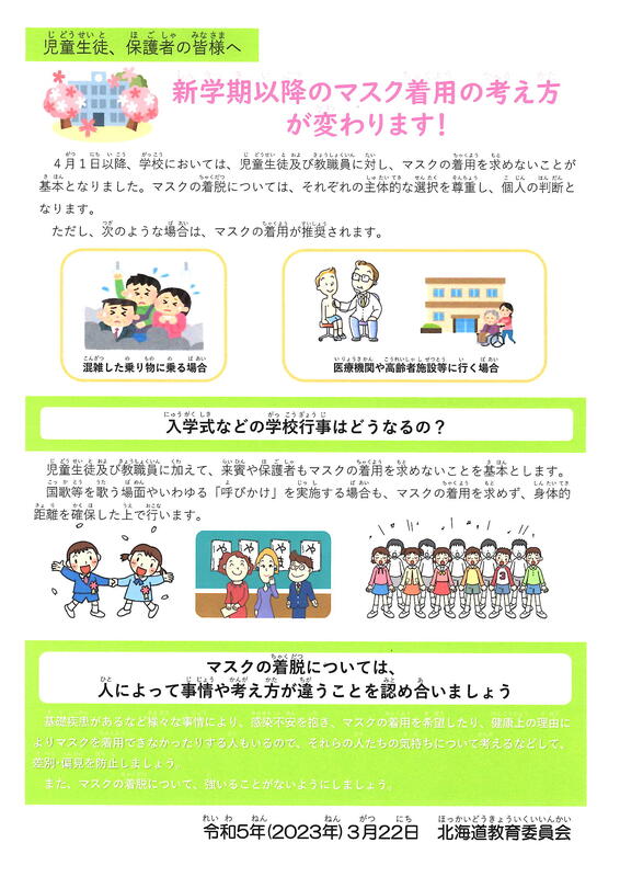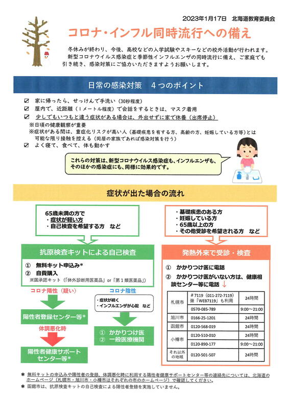 新しい年を迎えると、いよいよ3年生の自己実現への「挑戦」です。3年生の希望進路が、農業、商業、工業、食について、酪農、語学、スポーツや音楽、職業科の高等支援学校、通信や単位制等々、多様な特色を持った高校であり、自己の強みを活かせる多様な進路先を選択していることを頼もしく感じます。先日、「北海道の高卒・大学卒の就職者の3年以内の離職率」が、「高卒41%、大卒34%」という報道に愕然としました。もしかすると、中・高あたりで抱いた「なりたい自分と目指した進路」と、「就職して始まった社会人生活あるいは仕事」に、何かギャップがあったのでしょうか?「いつまでも日本は終身雇用制」とは言いませんが、義務教育9年間をあずかる学校として、キャリア教育がどうだったのか、残念な気持ちもぬぐえません。