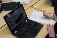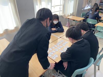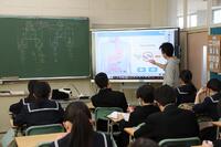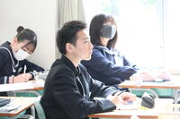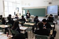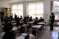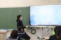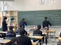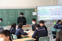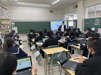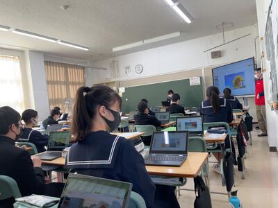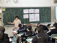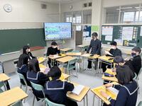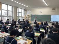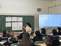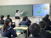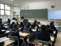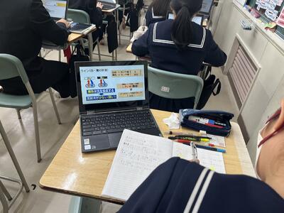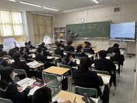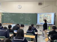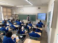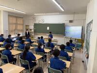 写真1:2年生社会では、1900年代初頭の不平等条約改正の道のりについて学んでいました。「治外法権」や「関税自主権」についてスライド等でも理解し、関税自主権の回復等にどう取り組んでいったのか、歴史の歩みをたどっていました。