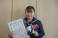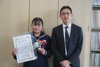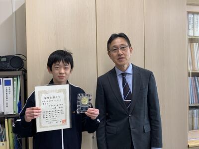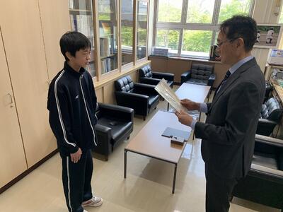 4月29日、石狩管内春季卓球大会が開催され、2年生シングルスの部で、千歳中学校、木浪さんが第3位に輝きました。校長室にて、伝達表彰しています。管内的なレベルの高い石狩管内で第3位の成績は、大変名誉なことであり、2年生ながら今後の活躍が期待されます。若年期のスピード、瞬発力、テクニックの習得が、後々の競技生活の中で大きく影響してくるスポーツです。市内中体連も間近ですが、日々の集中した練習の積み重ねで、千歳中卓球部の躍進に期待しています。