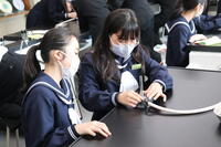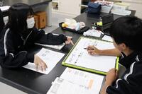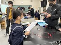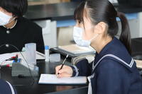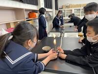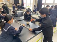写真2:理科では、乾燥した冬に良く体感する静電気についてストローやティッシュで、起こっている現象を科学していました。「物体は+と-の電気をそれぞれ同じだけ持っていて・・」「物体の電気のバランスが崩れている状態・・もしくは、バランスを崩している電気そのもの・・」「異なる物体同士がこすったりなどして接触したとき・・」目には見えない原子・電子・・起こっている現象を理科・科学の見方・考え方を働かせて科学する・・生徒の皆さんの真剣な表情が印象的です。