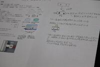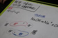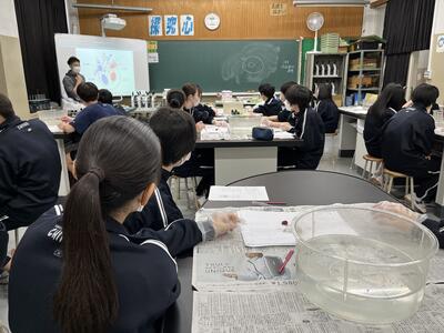 3年生理科の授業では、前時に実験した実験結果や考察、既習事項の電離式等から、「酸性、アルカリ性の正体は何だろう?」という課題に、9グループの実験グループが、チャレンジしていました。「陽極・陰極付近にリトマス紙の変化をもたらしたものは?」「ーイオンは、〇〇極に引き寄せられるので・・」「電離式に示されたように・・・」「陽極、陰極の色の変化から・・」、グループの考察場面では、目には、見えない科学現象をどう図や理科的な用語で説明するか、みんなが、起きている現象について理解できるよう、実験結果の図や電離式に着目して、対話を深めていました。科学者のような理科特有の「見方・考え方」、グループの教え合い・学び合い・議論の深まりに感心する授業でした。