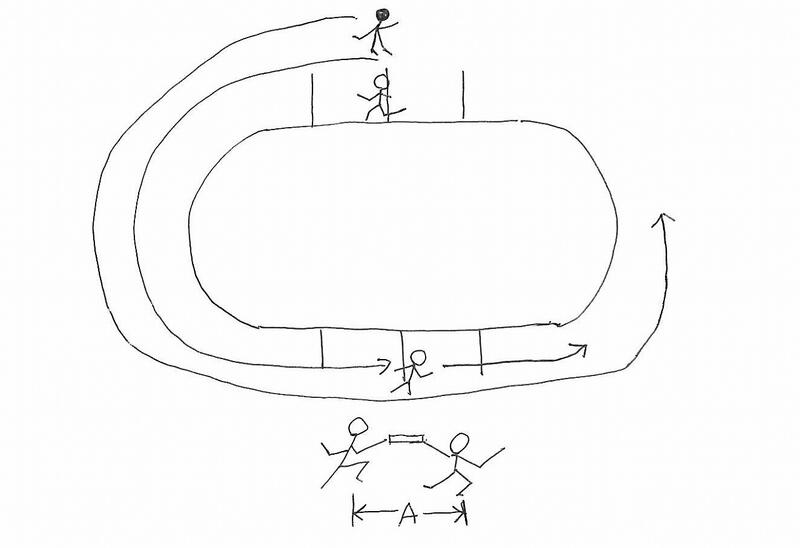 〇+〇 200m のタイム < 10+10秒      バトンパスをした方がタイムは縮みます。これには大前提があって、「前走者と次走者のスピードを同じくする」必要があります。「ゴー・・・・はい・・」等、コミュニケーションを図って速度ロスをなくします。そうすると、授業で習ったA(利得距離)の部分は、誰も走っていません。バトンが手渡しで移動した利得距離が得られます。(利得距離を大きくするには・・もうお分かりですね・・)