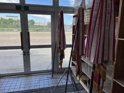 明日は体育大会。保健室前には、「けがに注意しましょう」等、健康・安全を守る掲示物が・・。76年の歴史ある千歳中学校の体育大会の優勝旗が、朝の段階で、準備されていました。放課後は、生徒会・委員会活動を中心にみんなで会場準備や明日の補助役員等を確認。昨年度来、学校行事や各種集会、委員会活動の中で、本校生徒の持っている「明るさや素直さ」と共に、役割を担い、ミッションを実行するときの、「自治力の高さ」「責任感と実行力」「創造性」を実に感じます。今シーズン初の24度越えにも、愚痴ひとつ言わず、協力しながら各種作業や競技運営・進行確認等、責任を持って取り組む姿は、座学の学習だけでは分からない、社会性、コミュニケーション力、生きる力、といった生徒たちの『強み』を感じます。