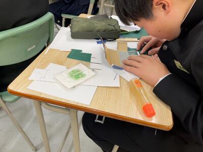 なぜお菓子の袋が膨らんだのか気体の粒子を用いて説明してみよう・・という実験・考察・まとめに取り組んでいました。「目の前で、起きている科学現象を(理科特有の見方・考え方を働かせて考え)理科・科学的なことばを用いて説明できることが大切。「空気を抜くことで、粒子が減り・・」「容器内の気圧が低くなるので・・」「風船内の気圧の方が高くなるので・・」グループごとに、起こっている現象を、図や言葉の表現で、発表していました。主体的に学び合う姿勢が立派です。「起きている現象の説明」には、最適解もあると思うので、「対話的に学び合うことで、みんなが最適解に達して、自分の言葉で表現・説明できるようになってほしいなぁ」と感じる授業でした。