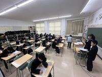 3年生の廊下には、「落語」の芸術鑑賞教室の時、寄席文字で色紙をお願いした「合格祈願」の文字。また、修学旅行で、訪れた学問の神様「菅原道真公」を祀る、全国天満宮の総本社である北野天満宮の学業成就の御守りが飾られています。3年生数学の「理解できていない問題の再チャレンジ」の場面では、わかっている人にレクチャーを受けながら「自律解決」を図る姿に、受験生として学びに対して、いいチャレンジ、いい協力ができていることに感心させられます。「わかっている段階から、自分でできる段階まで」、ねばり強いチャレンジに期待します。