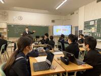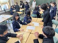 1年生社会科では、ヨーロッパ連合(EU)が、なぜ統合に向かったか・・・様々な資料や統計グラフ等(資料活用)をもとに、グループで考えを出し合い、対話の中から深め合っていました。「1ユーロって何円ぐらいだったっけ?150円くらいじゃない・・、1ドルと1ユーロを円に換算すると同じくらいかな・・、この収入のグラフは円に換算すると・・。」そんな会話がとびかいます。資料活用の力とともに、様々な資料をもとに、地理・歴史・公民的な視点で、「なぜこうした動きになったのか」社会を読む、自ら考える力がついてくるなあと感じる授業でした。