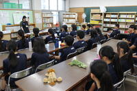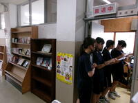 昨日に続き、本日も非常に気温が高い中、暑熱対策を行いながら教育活動を進めています。今日は1年生が、図書室にて図書司書さんが紹介する「夏休みのおすすめの本」の紹介を聞いていました。気温が非常に高い中ですが、子どもたちは熱心に話を耳を傾けていました。