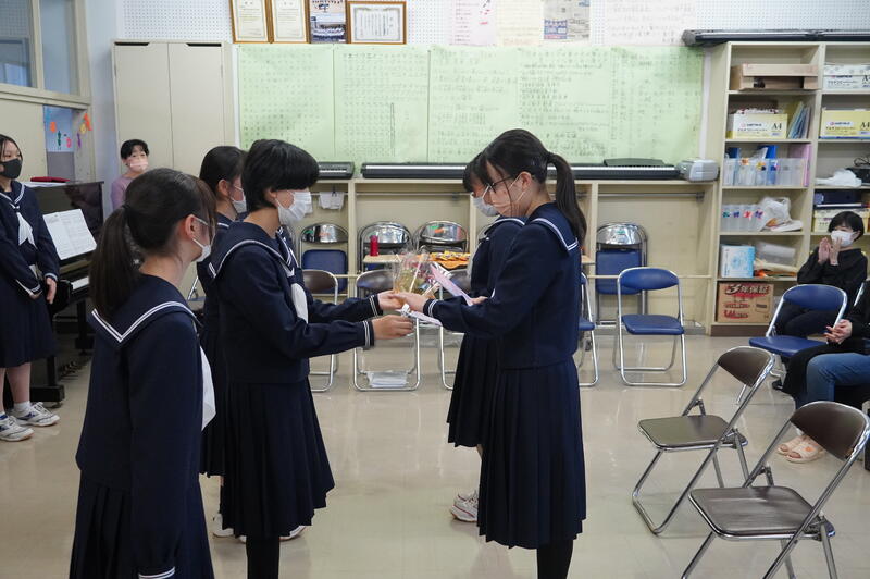 10月29日(金)の放課後に合唱部の引退式を行いました。コロナ禍の中で、なかなか思うような活動ができなかったにもかかわらず、とても感動する歌を披露してくれました。