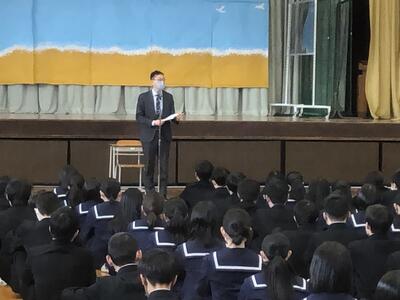 2月13日(月)4時間目に3年生のみ学年集会を実施しました。はじめに校長先生からお話がありました。『高校の先生方は、高校に入学した後にどんな夢や希望を持ち続けて、学びを継続する生徒なのかを見たいんだよ。だからこそ、目標を持って頑張ることがみんなには大切なんだよ』と言う話がありました。明日からいよいよ私立の一般入試が始まります。今までの自分の努力を信じて頑張ってきてほしいと思います。頑張れ!千歳中学校3年生!!