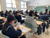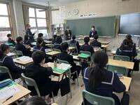 3年生は、受験期の学習の総まとめです。面接の中で、自らの強みや考え方、生き方について、どう表現していくか、生徒同士、多くの先生と、面接練習をしています。「将来、〇〇になるために、語学力を伸ばし、多様性の世の中で国際感覚を持った大人になりたい」「例えAIが進化して多くの仕事が取って代わられても、〇〇という職業は、豊かな感性とコミュニケーション力を必要とする人間にしかできないと考えています」「SDGsや貧困、環境問題等、解決しなければならない大きな問題も、地球規模で考え、身近な足元の行動から取り組んでいきたいと考え、地域清掃やボトルキャップ収集、子ども食堂のお手伝い等に取り組んできました」・・・中3のプレゼン力に脱帽します。英語、商業・工業・農業・酪農、アウトドア・スポーツ・音楽等々、多様な進路選択と「自己の強みや将来像、選択の確かな根拠」に、未来を担う人材としての頼もしさを感じます。自己実現に向け、受験期の健康管理にも十分気を配り、頑張ってください。全校みんなで応援しています。