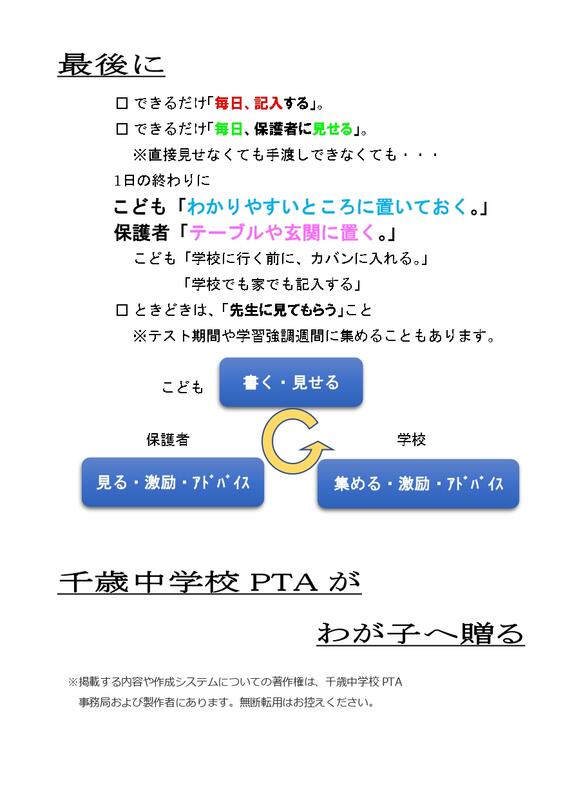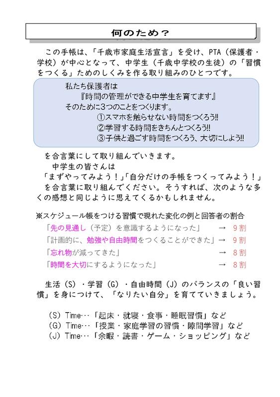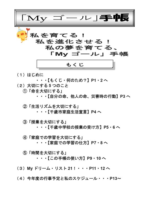このMy ゴール手帳は、「千歳市家庭生活宣言」を受け、PTA(保護者・学校)が中心となって、中学生・千歳中学校の生徒としての『習慣をつくる』ための取組のひとつです。この取組が評価され、令和4年11月18日「千歳中学校保護者と教職員の会」が、文部科学大臣表彰を受賞しています。