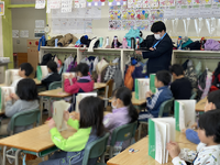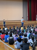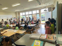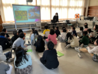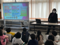 1年生は音楽の授業です。2年生は生活科。トライアルなど自分の住んでいる地域について学んだことを班ごとに発表しています。3年生は体育館でカルビーの方をお招きして学習しています。