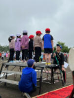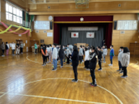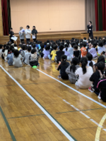 校長先生のお話や表彰式の後には、縦割り班でレクを行なっています。