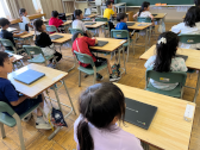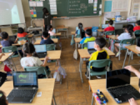 一年生が初めてタブレットで学習をしました。QRコードを使って自分でログインし、担任の先生の説明を聞いて画面をクリックして操作しました。ミライシードというソフトで少し勉強もしました。今後、使う場面が増えていきます。
