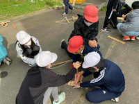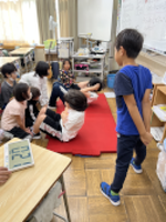 一年生がくるみ幼稚園の年長さんを招待して、お店屋さんを開きました。少し緊張気味だった年長の皆さんも、お店屋さんで紙飛行機やフーフーゴマなどの作り方を教えてもらい、その他たくさんの遊びを楽しむうちに笑顔になっていました。一年生は、優しく声をかけ、手を引いて、先輩としての振る舞いに頑張りが見られます。頼もしいです。