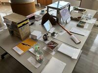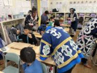 6年生が、中休みにドリームステージで開いたイベントに、多くの子ども達が集まっていました。総合的な学習の時間に、千歳市の世界遺産「キウス周堤墓群」について学んだまとめとして、「縄文時代のくらし」や「キウス周堤墓群」に興味をもってもらおうと開いたイベントであるということです。