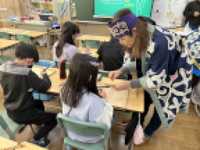 2年生の昔遊び体験です。清流親和会の15名の皆さんにご来校いただき、竹とんぼやお手玉、紙飛行機など7種類の遊びを体験しています。給食まで交流しました。