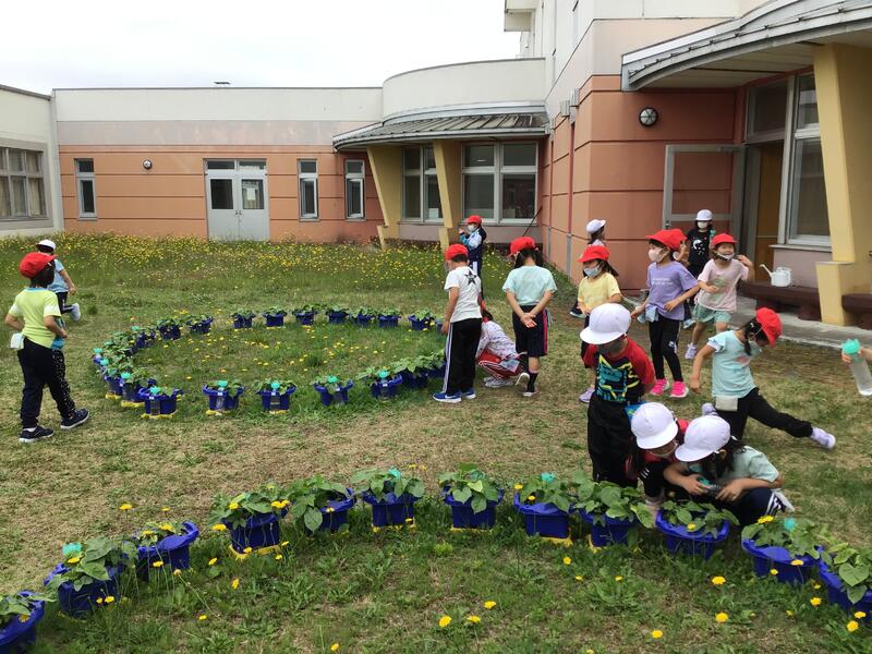 1年生は学校の中庭でアサガオを育てています。まだ背が低いですが毎日のお世話ですくすくと成長しています。花が咲くのがとても楽しみです。
