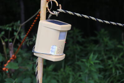 鹿や小動物が近づくとセンサーが反応し、サイレンや犬の鳴き声、豚が闘う声(?)などが響き渡ります。この音や鳴き声なら驚いていなくなるはずです。