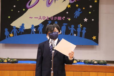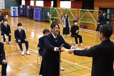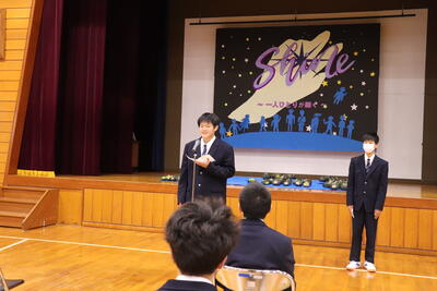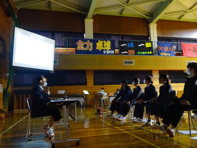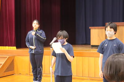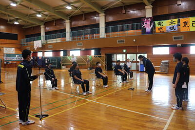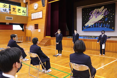 今日は「定例集会」、生徒会と常任委員会から活動についての確認やお願い、中体連の表彰伝達がありました。
