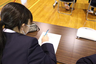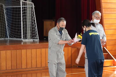最後に生徒会長から1年生にファイルとペンのプレゼントが贈られました。