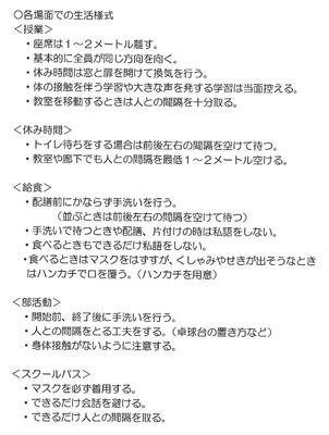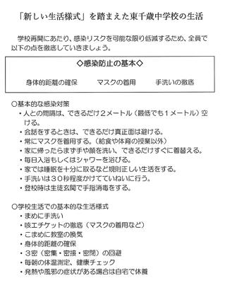 コロナウイルスの治療薬や予防薬の開発、治療法が確立するまでは学校内外で新しい生活様式で過ごさないといけません。配布されたプリントをもう一度読み、学校版の新しい生活様式に慣れていきましょう。