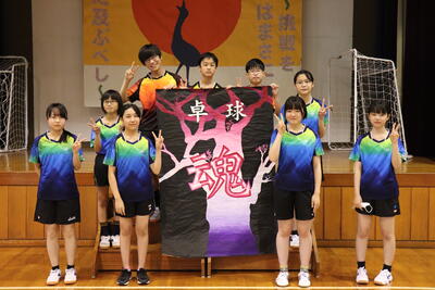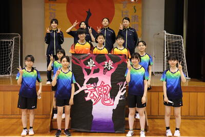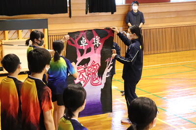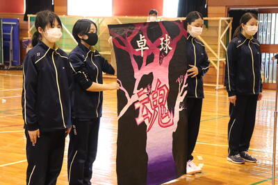 卓球部員一人ひとりが決意を述べた後、4名の文化部から『魂』のこもった応援旗の贈呈と、卓球部員へのエールが贈