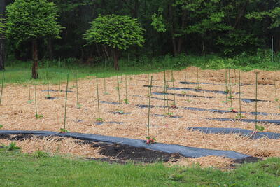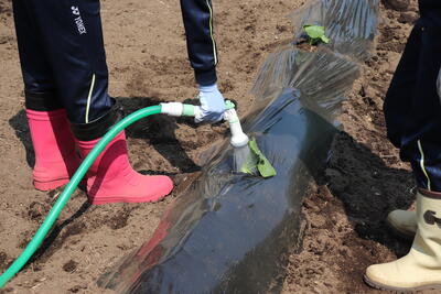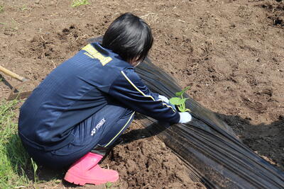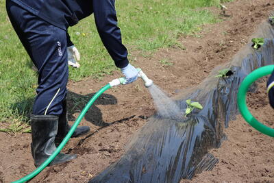 昨年、カボチャの苗が何本か強風で飛ばされてしまったため、苗の所に棒を立てて対策をしました。