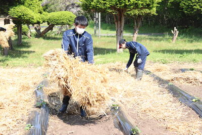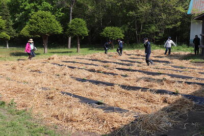 先日カボチャの苗を植えた畑に麦わらをまきました。