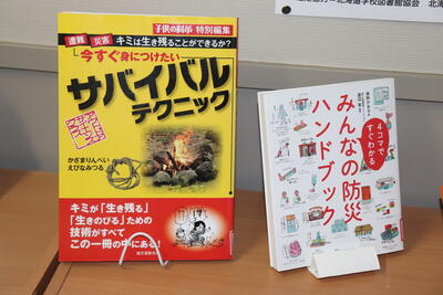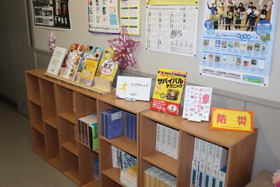 今日は防災の日ということで、図書司書の宮下さんが図書室前に『防災コーナー』を設置してくれました。